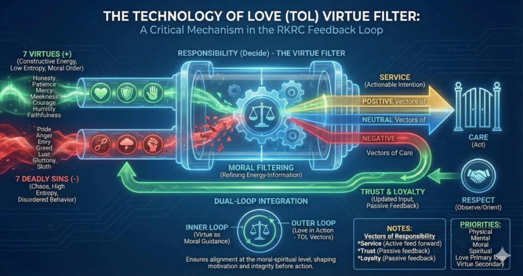 - Virtues reside in Responsibility, shaping decisions through moral filtering. Reference the book Technology of Love Vol 1, Chapter Love’s Spontaneous Order (Part 1), and Index entries: “Virtues” pp. 6, 219–220, 222, 226, 246, 256, 261–262, 303–304, 350, 391; “Virtuous” pp. 22, 25.